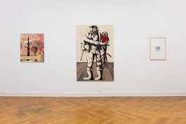 The human being appears here less as a foreign body than that it organically fits in. Gently and trustfully, the figure nestles its hairless head against the thorny stem and lets its legs blow in the wind or, as if under water, drift in the opposite direction. The feet are the same color as the petals, almost as if a transformation is taking place, a metamorphosis - the little human being is becoming floral. An animistic approach is also taken by Ferdinand Dölberg, in whose work faces literally appear at eye level with the tree top. It is unclear whether these are human trees, constructivist sculptures, or magnified street lamps. The moon faces themselves also have a thoroughly ambiguous expression: gentle, reassuring, but not necessarily cheerful, they look at us from their slightly out-of-place position - looking into the world in which they do not quite belong, but which they bathe in a pleasant (moon) light with their presence. Above them, a bare tree trunk is lit like a lighter. One of the two faces is shown only cut, one recognizes that the two figures are similar, but not alike - whether one perceives them as actual individuals or abstractions of the human is left to the viewer. Georg Vierbuchen uses discarded construction site warning lights, which he cuts in half and attaches to the image carrier in the form of a sun. The LED lamps, which are normally intended to delimit a territory, to mark it and for safety reasons to indicate that it cannot be entered, here become a force of nature themselves. The halved warning lights, as transformed ready-mades, are installed in the form of sunbeams - spreading their light on the image carrier and in the (gallery) space surrounding them. Their warm light, with which we associate both protection and threat, mixes with the cold light of the White Cube. It is both a conceptual and sensual approach that the artist takes here - the abstraction of the sun refers to an infantile understanding of the world, in which the unrepresentable of nature is put into a universalizable form: The sky and water blue, the clouds white and clearly outlined, the sun placed in the upper right corner, four defined rays of sunlight emanating from it. The treatment of non-disposable material, the ruins of civilization, is also present in Georg Vierbuchen's work - art here becomes a refuge for the objects left behind, a renaturalization of the artificial. Victor Payare's painting represents the very reality of nature, of which most people are afraid and which for centuries has been supposed to be tamed (by painting). We no longer see a "slice of landscape", we see the whole, sublime brutality of it, in its terrifying beauty. The limits of language, or of what can be grasped, named, and classified, are revealed and transcended - taxonomy and lexicality disintegrate, leaving a contradictory but poetic dimension. Employing a strategy of unlearning, Payares manages to confront us with the unrepresentable. It is a loving, almost sentimental look at the potential violence of nature. The viewing subject blurs with its surroundings - something breaks (as an event) over the viewing subject and makes complete distance impossible. Nature is sublime to the observer. Perhaps this is also what is to be triggered by the escape from the city - an escape from the world that expresses not only a privileged enjoyment, consumption, and a longing for purity, Cottage Core, but also a desire for transgression - the abysmal is to be affirmed, nature is not only to be tamed, put in its place, but the human being itself is to be revealed in its limitedness. We are not apart from it, we are part of it, whether we like it or not. No frame, lense or canvas can change that. The medium of painting remains perplexed in the best sense - and the works thus inexhaustible. Underlying all the positions is a certain romanticism as well as a terror, a radical longing as well as a cautious, loving fear - something tentative that slowly blossoms, in different directions. In the attempt to capture something that eludes our concepts and our perception, all artists produce in their own way something unfathomable, enigmatic, mysterious - something that eludes us, that withdraws, just like nature itself. Painting becomes a piece of nature, a slice of landscape. Or even more: Not only a slice, but the whole cake. It transcends the boundaries of the canvas and radiates onto us, the viewers, incorporating us just as we incorporate it.