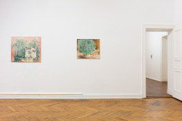 The concept of landscape presupposes that a "piece of nature" is selected and demarcated from the potential boundlessness of the "natural environment" - which, in turn, is to be perceived by the viewing subject as a kind of aesthetic wholeness. A landscape is thus something primordially limited, which, however, is not consciously perceived in its quality of being partial. The infinity of the real of nature, of wilderness, is terrifying - all the more important it is for urban beings to capture it exclusively in its imaginary limitedness, to tame it. There is a long tradition of landscape painting - and ever since the beginning of urban spaces, urbanites seem to have been attracted to capturing landscapes on canvas, sometimes en plain air. The mystical transfiguration of nature continues into the present with phenomena such as Cottage Core. Even in the face of climate change, a retreat into nature or a life involving its forces suddenly is particularly plausible and even necessary. The dichotomy of nature and culture seems to have been exhausted; nature can no longer be perceived as the other alone. In contemporary art, too, artists react to this downright invasion of forces not only in the form of the traditional attempt to tame them, to subdue them, but also in the affirmation of being overwhelmed by them. It is not only a longing for purity that is practiced here, on the contrary: artists become aware, in different ways, of the inseparability of the (painting) self from its environment. Above all, the practice of painting, in its materiality and physicality, supports the potential for becoming autonomous. In Emilia Urbanek's works, the bush stands as a metaphor for a part of the self and at the same time for a place to hide. As a potential place for coincidental and unexpected encounters. I planted my guts behind the house, they grew to be a glossy ass bush, sometimes I hide in it. Planting and domesticating the bush becomes an act of self-empowerment. The physicality of the plant is revealed, for example, in the almost carnal representation of the stems and leaves. The title „Vanitas incoming“ functions as a humorous art historical reference - skulls were traditionally depicted on so-called "vanitas" still lifes, symbolizing both "vanity" and the " ephemerality of earthly life." In Emilia Urbanek's work, however, the term "vanitas" becomes a symbol of constant change. Here, transience is above all a state of transition, also from the real to the not-yet-real. Noemi Pfister's work, on the other hand, represents an alternative - a parallel world in which the separation between human and nature has become fluid. We see a figure that moves between punk aesthetics and a mythical creature. In the otherworldliness of all elements, the depicted world borders on the fantastic. Nature is not perverted into a status symbol here - it is left free in its being so - the human a part of it. A utopia that plays with codes of the social present and thus does not seem to be so far away - but seems almost pioneering. In Robin Rapp's work "Petit frère" we see two figures, according to the title presumably brothers, who sit in a kind of forest clearing and seem to be observing something that remains invisible to the viewer of the work. The spectator is almost placed in a voyeuristic position, from which, as if hidden behind a bush, they observe the two children - who are absorbed by their own activity. A parallel world opens up that we don't quite understand, but the two protagonists seem certain of what they are doing; obliviously, they sit in the clearing. They wear clothes that one would assign to the state of leisure, maybe it's vacation time. They have taken off their shoes, adilettes, very casually, as if they expect to spend a while in the very position they are in at the moment. The artificially bright green of the shorts blurs with the plants surrounding them, which, in the mirror of the Adidas shorts, suddenly look just as artificial. It is unclear whether the scene has something harmonious or something threatening - the two children could also be in danger. Through the position that is assigned to one, that danger could also emanate from oneself, the voyeuristic viewer. In Bahar Kaygusuz's photographic works, the body becomes visible as a landscape - just as domestication methods of the natural emerge. On the one hand, a tree is shown as a body on which (plastic) surgery is performed, then again a haired torso becomes a green landscape. The body resists the control that is exercised over it; it can never be completely tamed, but always retains something wild, unruly. In the photograph of a crowded beach, one not only sees a seashore populated by half-naked people - a total body almost results from the individuals, the human being appears as a kind of (insect) plague or as a (bee) swarm, one associates the terms population growth and lack of resources. At the same time, however, the individuals are shown in their fragility, their slightly desperate desire for harmony and purity, and, again, their need for leisure, which only ever arises in relation to its opposite: Work. Sophia Süßmilch interchanges the (hierarchical) scales of people and plants by linking a plant with a naked body - the naked is about the size of a single leaf. It could both a weed-plague or a rare, valuable species of cactus; the depiction allows for both interpretations.
