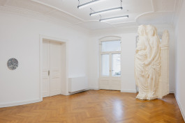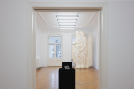 If Höschl’s work deals with the invisible and the barely visible, then Zuzanna Czebatul’s pieces assert their presence in the gallery space with an almost excessive visibility. Her large sculpture Probably a Robbery (2021), made from polystyrene and acrylic plaster, is almost too tall for the space. It depicts two female figures, the fragment of a pilaster, and an arch.