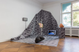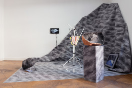 While reconstructing the conspiracy theory on spot, she surrounds her installation with seemingly authentic objects that in fact are just fakes. Or aren’t they?